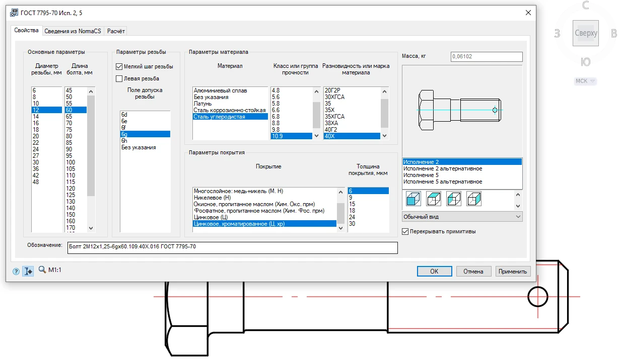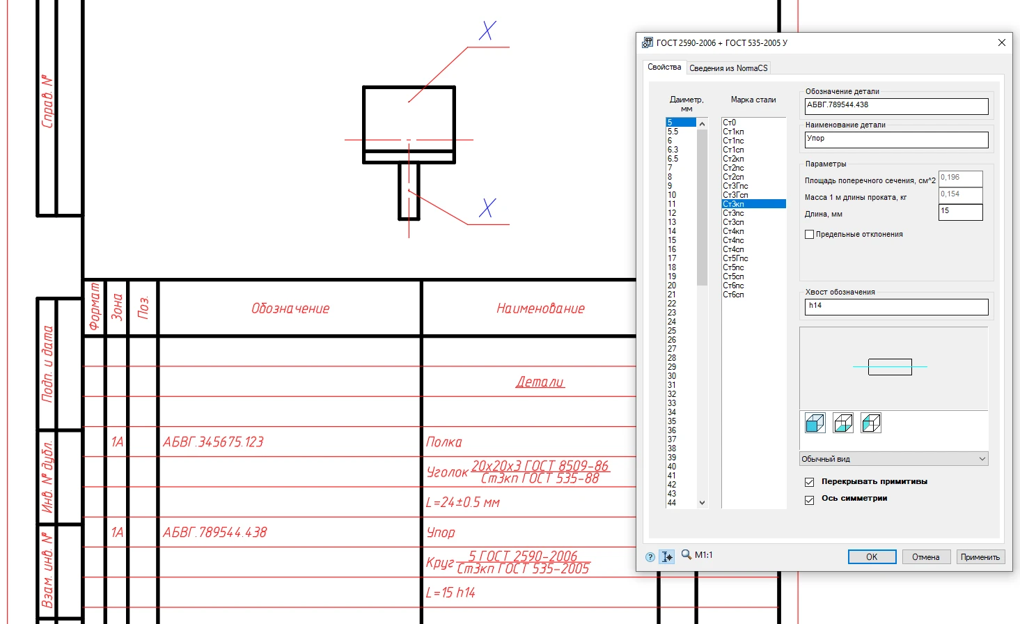 В базу элементов добавлены профили, у которых можно выбирать марку стали, а также задавать обозначение детали, наименование, предельные отклонения или квалитет длины. Все эти параметры автоматически попадают в соответствующие поля спецификации. У таких профилей сохраняется весь функционал построения геометрии (виды сверху, снизу, справа, слева, спереди и сзади, 3D-исполнения).