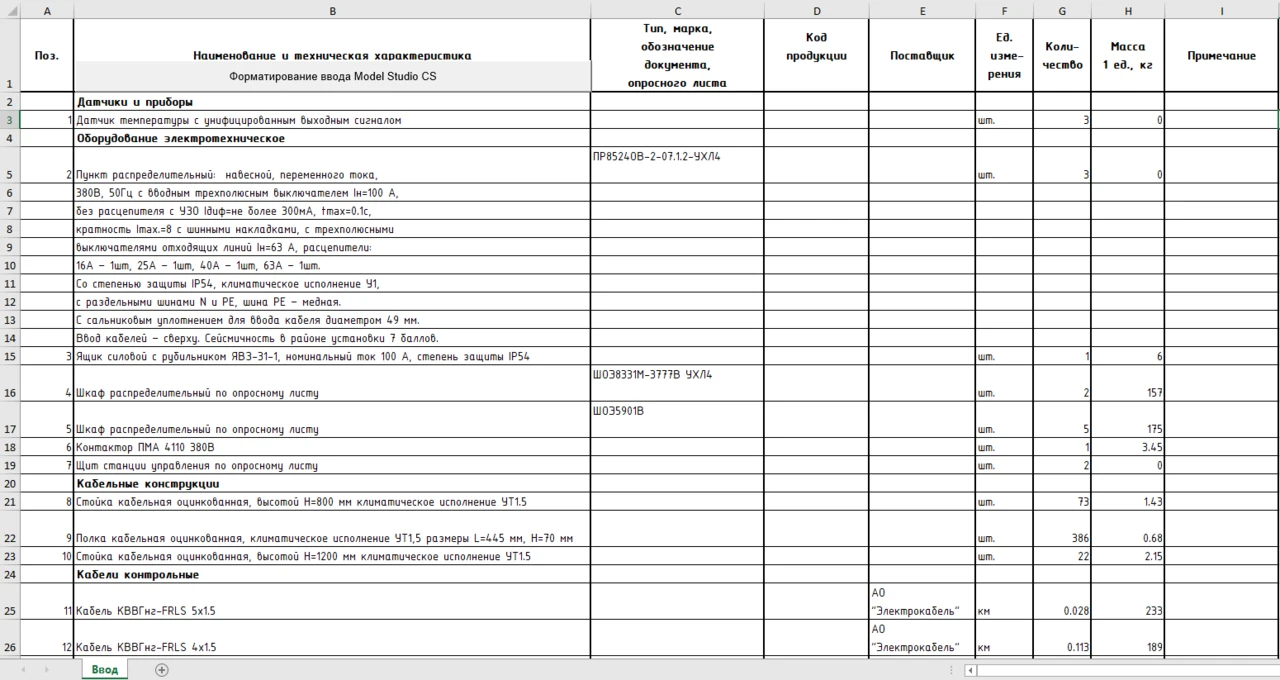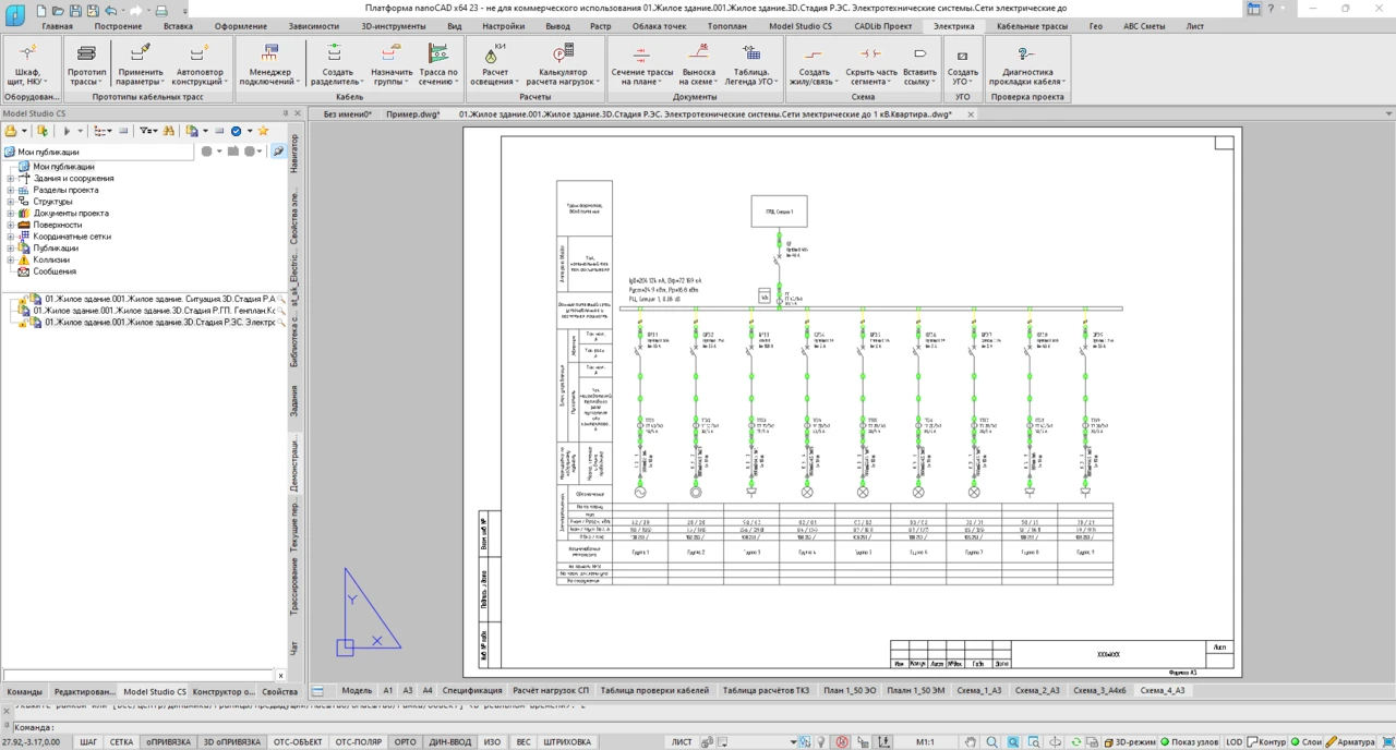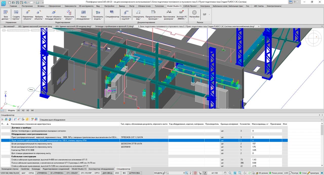 Model Studio CS Электрика — это программный комплекс, объединяющий в себе ключевой функционал разработки 3D-модели в части размещения электротехнического оборудования, создания кабельных трасс, раскладки кабелей, моделирования системы электроснабжения, проведения расчетов нагрузок по СП 256.1 325 800.2016 и РТМ 36.18.32.4−92, генерации схем однолинейных системы электроснабжения, проведения подбора коммутационного оборудования и кабелей.