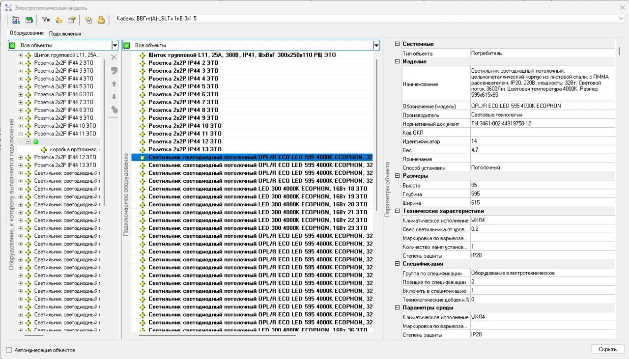 После соединения оборудования кабелями одним кликом мыши выполняется раскладка кабелей в трехмерной модели, при том, если…