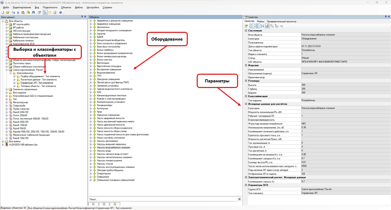 Инженер, использующий Model Studio CS Электрика, имеет все инструменты, необходимые для работы с базой данных: поиск (простой или с предварительно заданными условиями), предопределенные выборки, классификаторы.