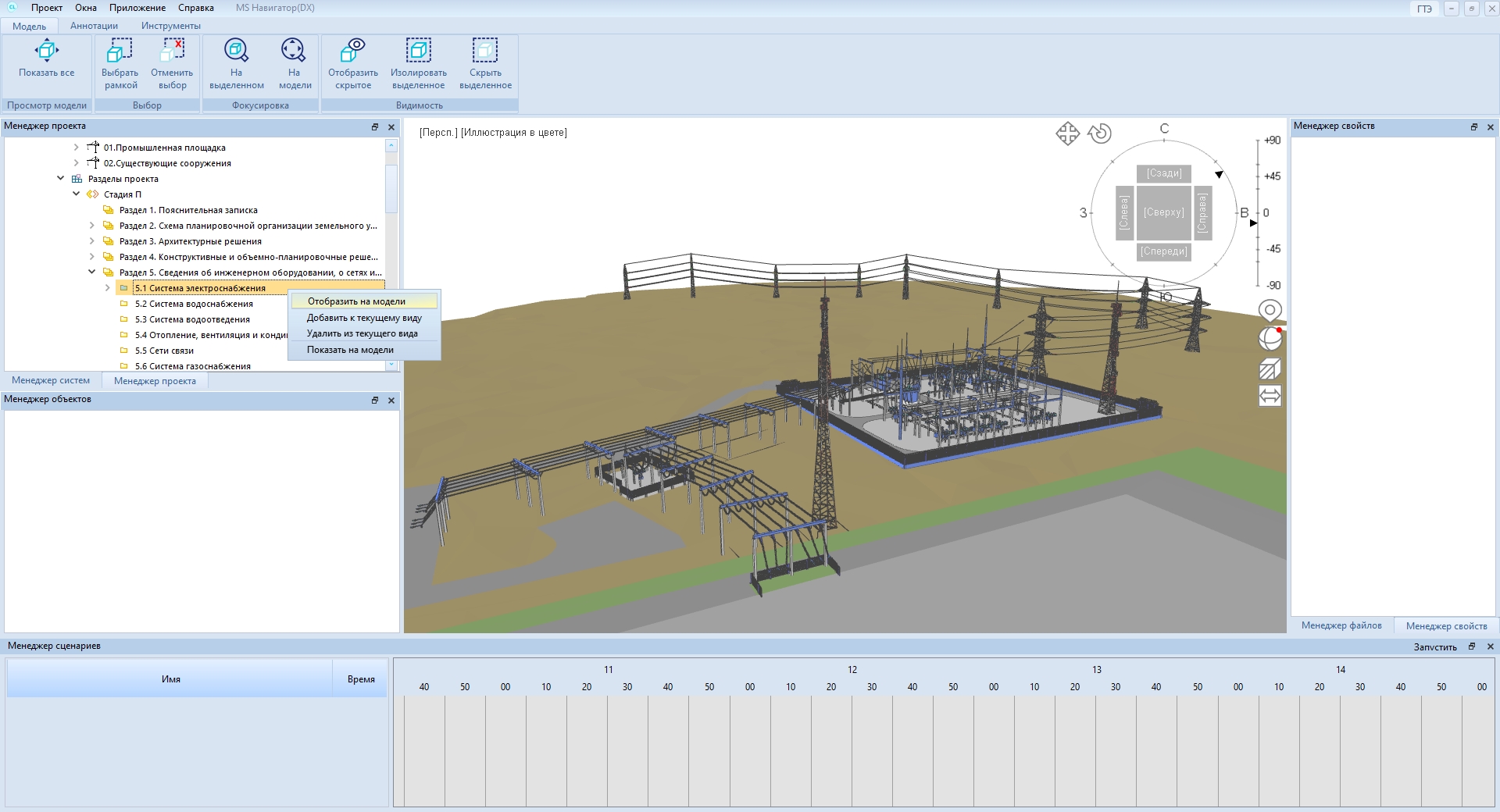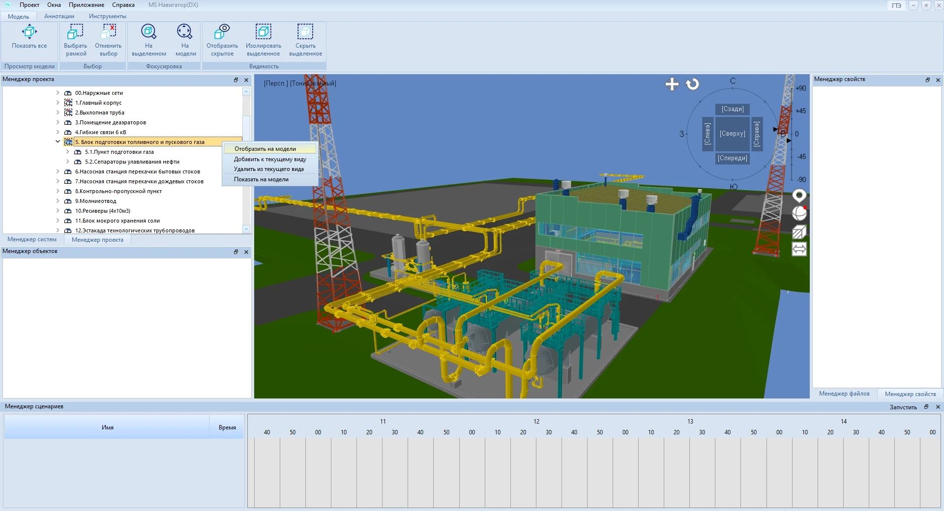 Технология проектирования промышленных объектов, общественных и гражданских зданий на базе программного комплекса MS включает в себя использование специализированных продуктов MS для разработки 3D-моделей и 2D-документации, программного обеспечения MS Модель и архив с целью объединения всей информации в общую 3D-модель, плагинов для получения моделей из ПО других производителей, а также для применения инструментов для просмотра, анализа модели заказчиком. К таким инструментам относится MS Навигатор. Приложение обеспечивает выполнение проверки и анализа проекта, позволяя открывать файл информационной модели для просмотра либо подключаться к базе данных проектной организации для доступа к актуальной информации.