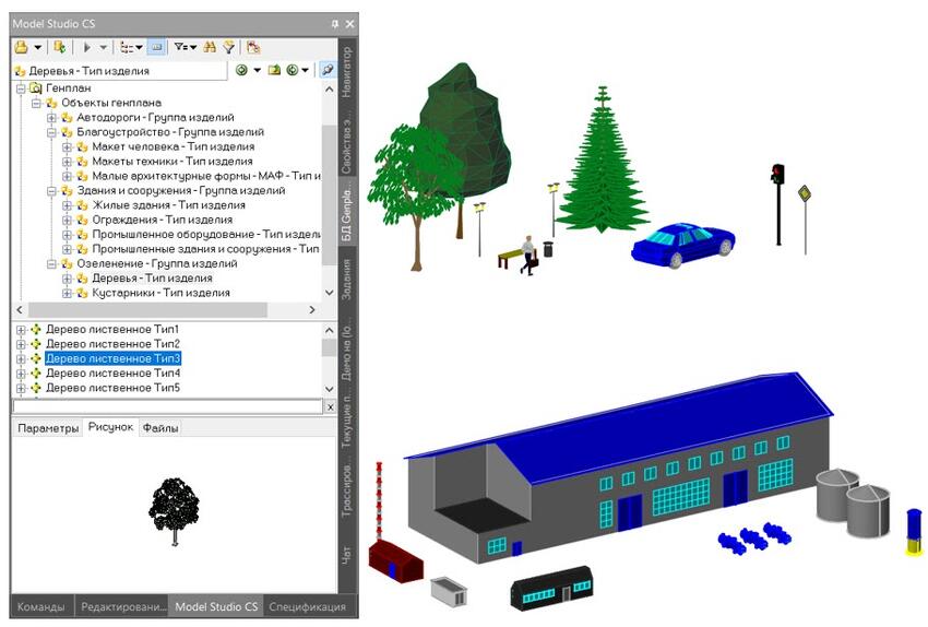 База данных изделий Model Studio CS Генплан включает в себя наборы типовых зданий и сооружений, элементов благоустройства (деревья, кустарники, малые архитектурные формы), элементов автодорог (дорожные знаки, дорожное оборудование, освещение), а также макеты людей и техники. Пользователь может самостоятельно пополнять библиотеку новыми элементами параметрической графики.