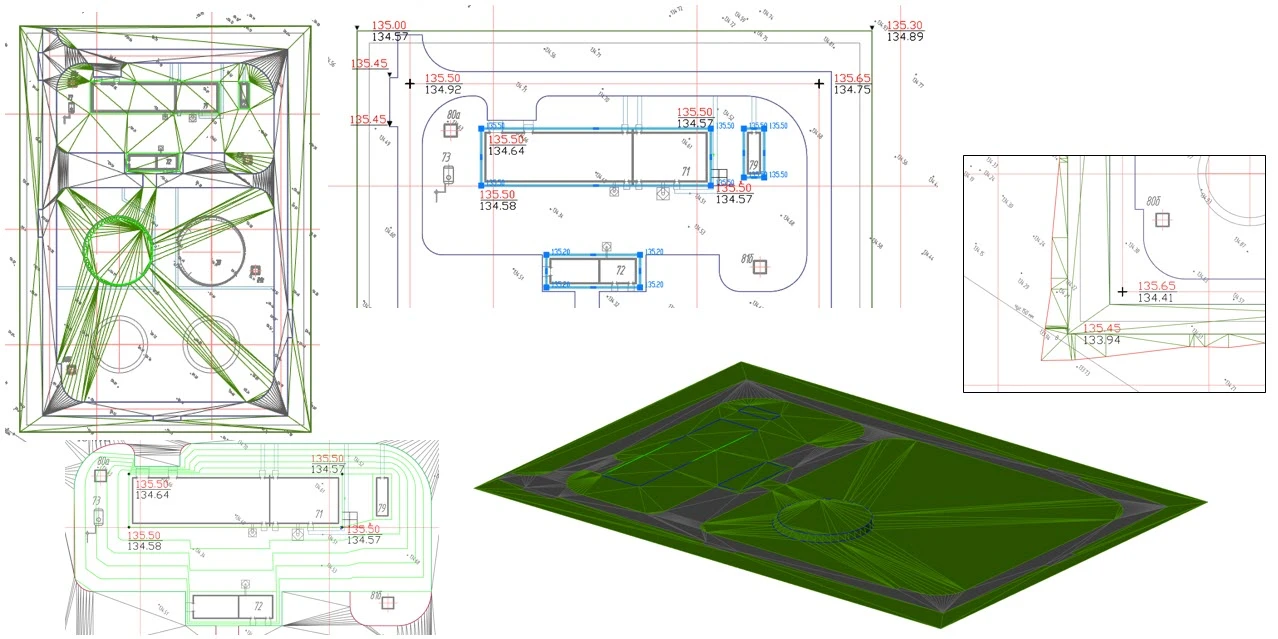 Трехмерная модель рельефа формируется в виде 3D-граней и строится с использованием отметок, структурных линий, внутренних контуров. Возможны расчет и отрисовка откосов с выходом на заданную поверхность, а также отрисовка горизонталей. Для редактирования модели используются такие операции, как переброс ребер, изменение отметки и перемещение узла, вставка и удаление точек.