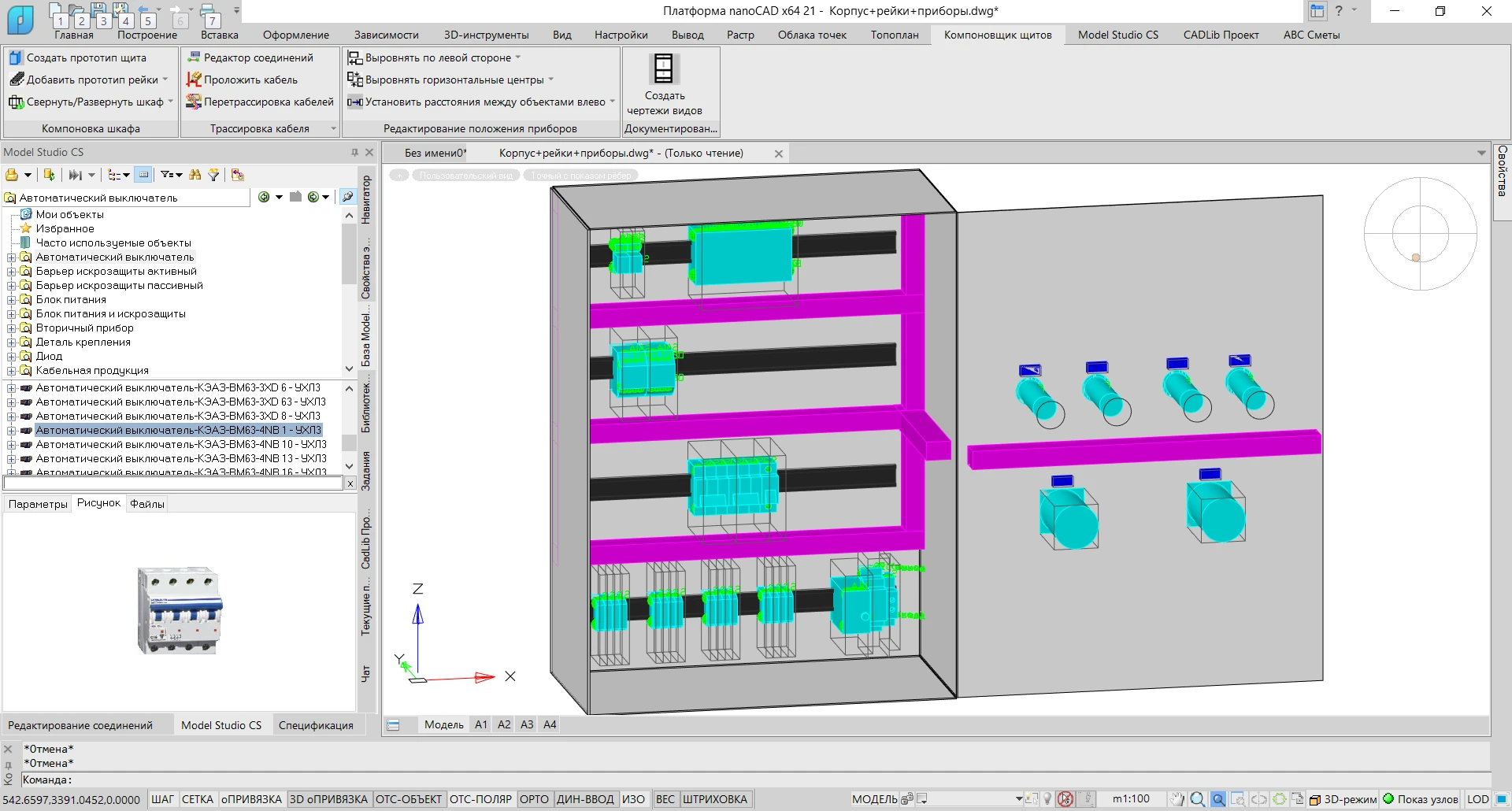 База данных оборудования, изделий и материалов Model Studio CS Компоновщик щитов встроена в среду проектирования и не требует вызова дополнительных программ. Она содержит щиты, фасадные и внутрищитовые приборы, детали крепления, кабели, провода и т.д.
