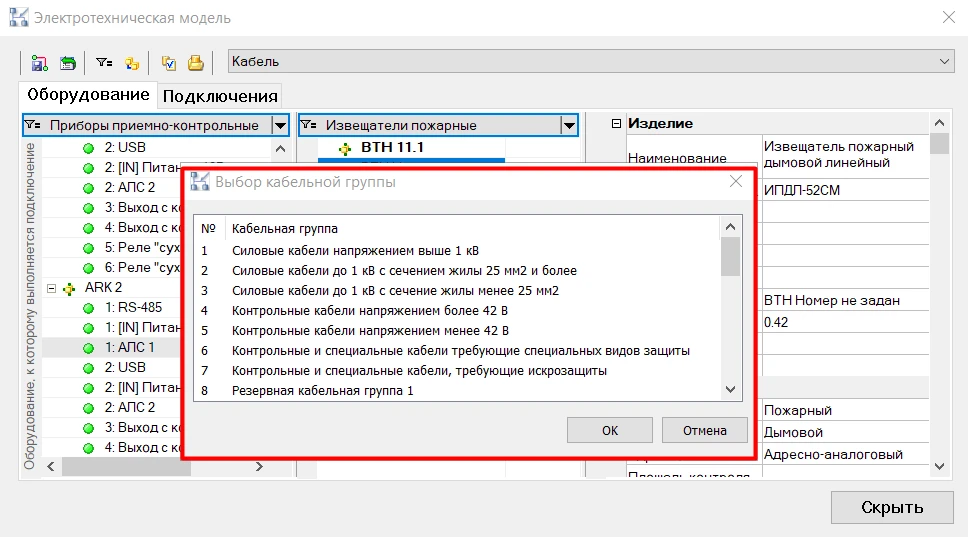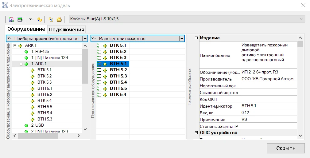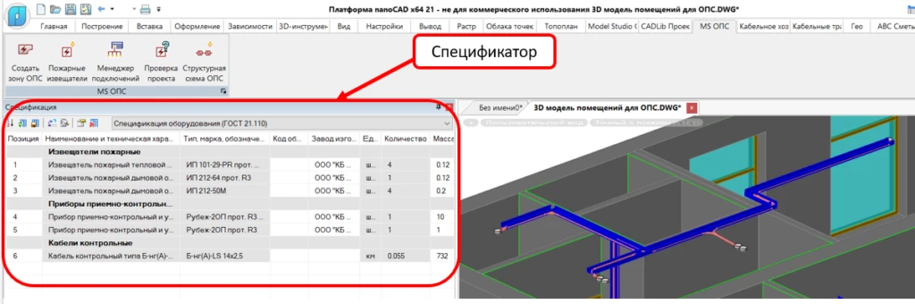 Спецификацию на оборудование, кабели и кабельные конструкции можно вывести в требуемый формат выходного документа. Перечень и количество примененных изделий вы можете в режиме реального времени просмотреть непосредственно в программе: для этого предназначен специализированный инструмент — Спецификатор.
