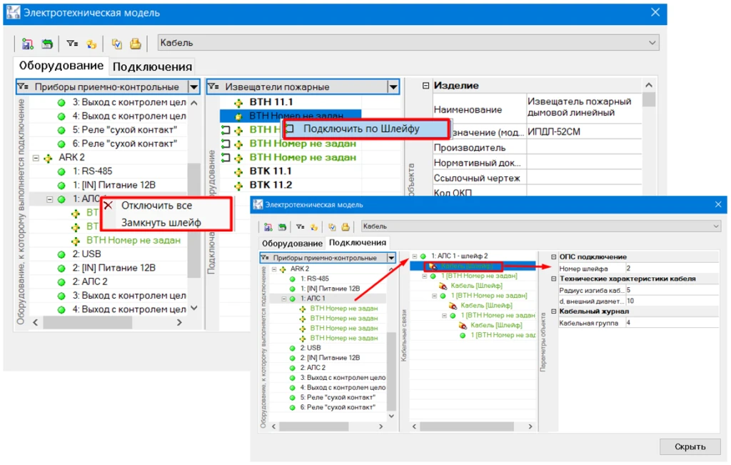 Теперь при подключении устройств через пункты меню Подключить/Подключить по шлейфу у подключаемого объекта показываются только узлы, совпадающие по типу подключения с узлом, к которому выполняется подключение.