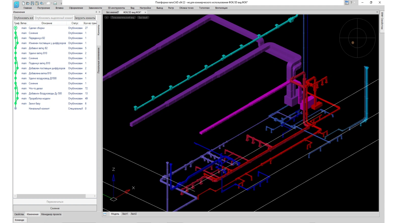 Команда проектировщиков может одновременно работать над единой моделью систем вентиляции и кондиционирования проектируемого объекта.