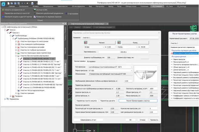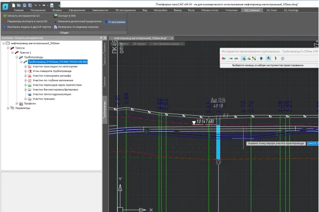 Создание проектных решений на профиле: размещение отводов/кривых, назначение футляров, размещение балластных грузов, определение толщины сплошного обетонирования и толщины тепловой изоляции трубопровода.
