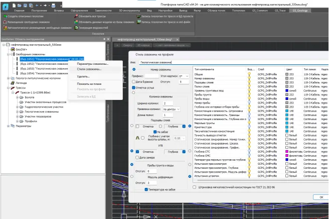Создание и изменение пользовательских стилей изображений скважин различных типов на плане и профиле, геологических разрезов для разных типов трасс, геолого-литологических колонок.