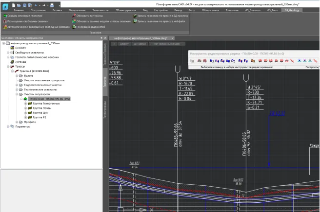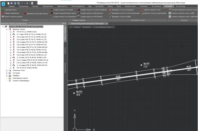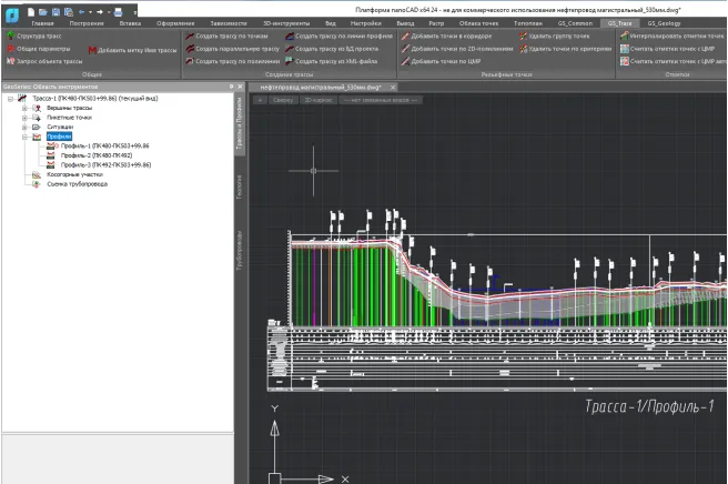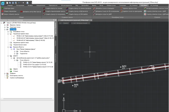 Автоматическое создание трассы проектируемого линейного сооружения по 2D/3D-полилиниям, другим линейным элементам чертежа: автоматическая разбивка пикетажа с заданным шагом, создание на трассе участков с различным пикетажем, ввод рубленых пикетов.