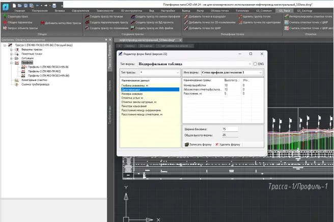 Построение продольных профилей трасс в заданных масштабах с настраиваемыми подпрофильными таблицами.