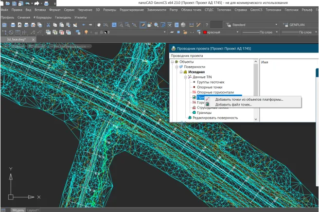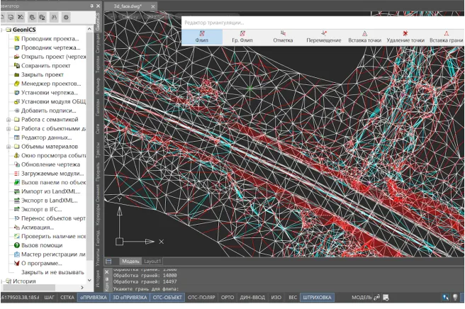 Ведение базы точек съемки проекта, создания, редактирования, отображения и анализа 3D-моделей поверхностей. Вариантность создания 3D-модели рельефа: текстовые файлы, ранее созданные чертежи *.dwg, 3D-полилинии и 3D-грани, точки с отметкой Z, блоки с атрибутами и многое другое.