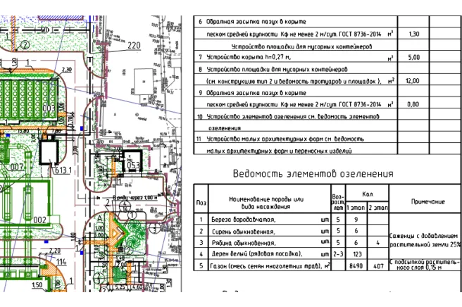 Расстановка зеленых насаждений, размещение малых архитектурных форм. Автоматическое формирование ведомостей и оформление чертежей к печати. Функции моделирования роста деревьев и кустарников, возможность «поднятия» на рельеф объектов благоустройства.