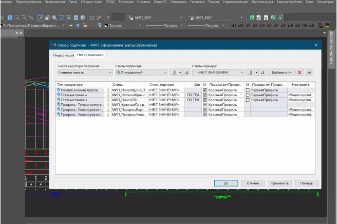 Поддержка свойств и стилей профиля, свойства и стили окна профиля, стили подписей профиля и окна профиля. Система стилей используется для управления отображением и смысловым наполнением объектов плана и профиля.
