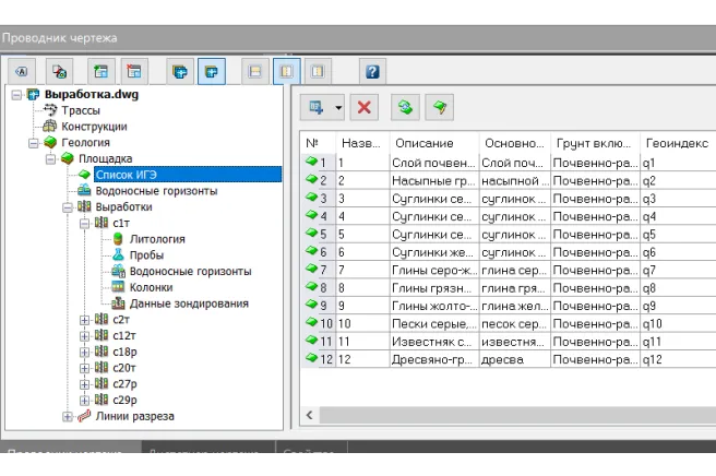 Хранение данных по выработке, ИГЭ, линии разрезов, данных о водоносных горизонтах, а также общих сведений.