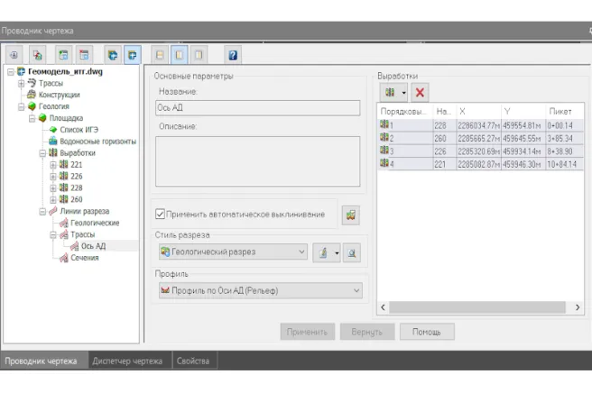 Операции проектирования и редактирования профиля с учетом ввода и мониторинга ограничений. Поддерживаются различные режимы создания профиля: отрисовка вручную, ввод из текстового файла, создание по 3D-полилинии, из отрисованных полилиний, по поверхности, трассе и т.д.