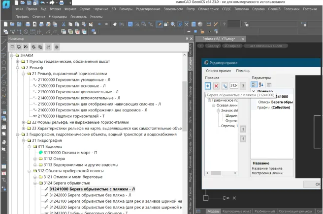 Встроенная справочно-нормативная библиотека открытого типа, где собрана информация по правилам отрисовки топографических знаков. Возможность создания собственных знаков.