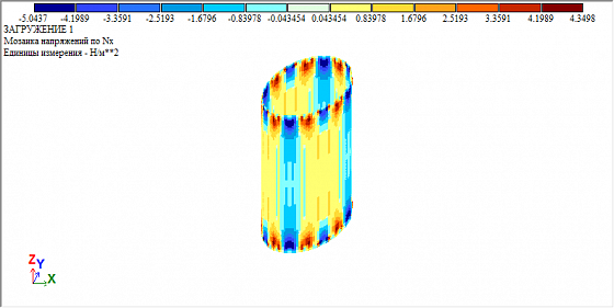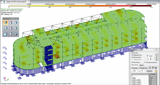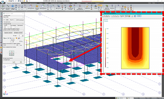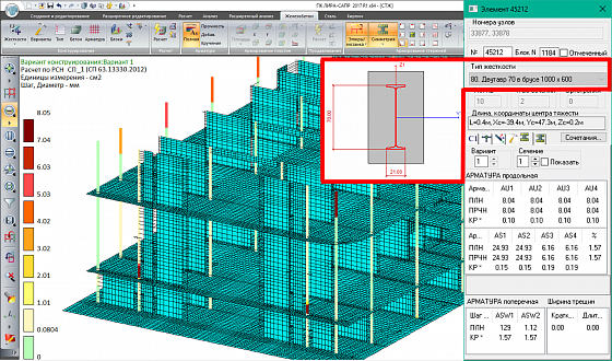 Возможность визуализировать на схеме любые исходные данные для конструктивного и МКЭ-расчета в виде мозаик жесткостей, сечений, типов КЭ, типов армирования и т.д. для удобного визуального контроля схемы, а также выбора элементов кликом по шкалам мозаик;
