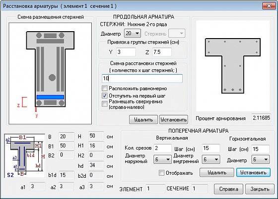 Выполняется расчет и проектирование (на уровне эскизов) элементов (балок, колонн) сталежелезобетонных конструкций. Задаются сечения жёсткой арматуры. Выполняется проверка заданных сечений и при необходимости подбор гибкой арматуры. Реализован широкий набор типов жесткой арматуры.