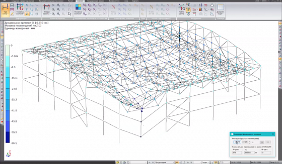 Система «ДИНАМИКА во времени» в отличие от расчета на динамические воздействия, реализованного в линейном процессоре на основе методов спектрального анализа, позволяет рассчитать на динамические воздействия нелинейно деформируемые конструкции – конструкции с односторонними связями, физически нелинейные системы, имеющие зависимость σ-ε в виде диаграммы Прандтля.