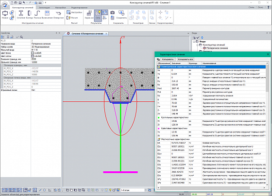 Система предназначена для формирования сечений произвольной конфигурации. Содержит процессор для вычисления осевых, изгибных, крутильных, сдвиговых и пластических жесткостных характеристик и построения изополей напряжений по заданным усилиям.