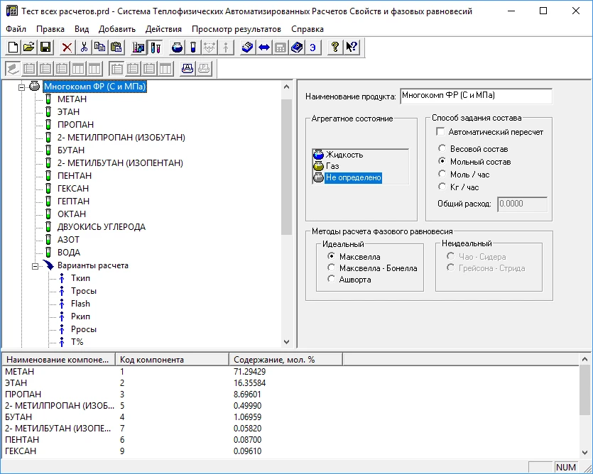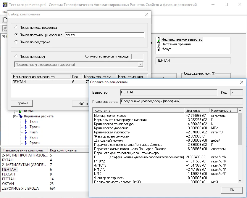 Дополнительно к расчету свойств и фазовых равновесий программа имеет следующие сервисные функции: