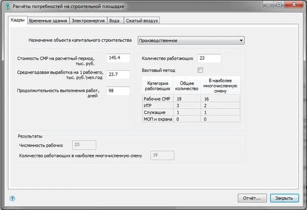 В СПДС Стройплощадка можно выполнить основные расчеты потребности в кадрах, временных зданиях, воде, электроэнергии и сжатом воздухе на основе МДС 12−46.2008.