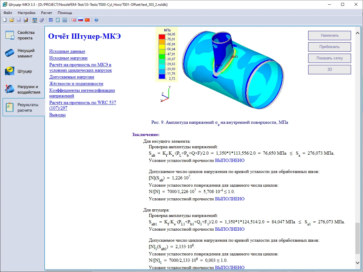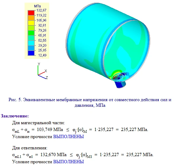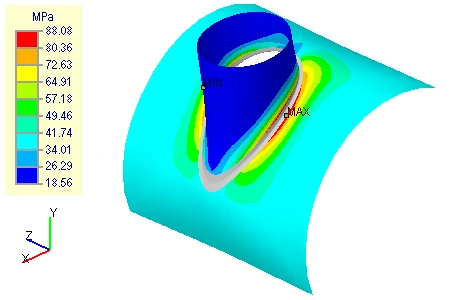 Расчет НДС выполняется как для радиальных, так и для косых врезок в цилиндрические и конические обечайки, а также эллиптические, сферические и плоские днища. Расчет с помощью МКЭ позволяет значительно расширить область применения и точность решения задачи.